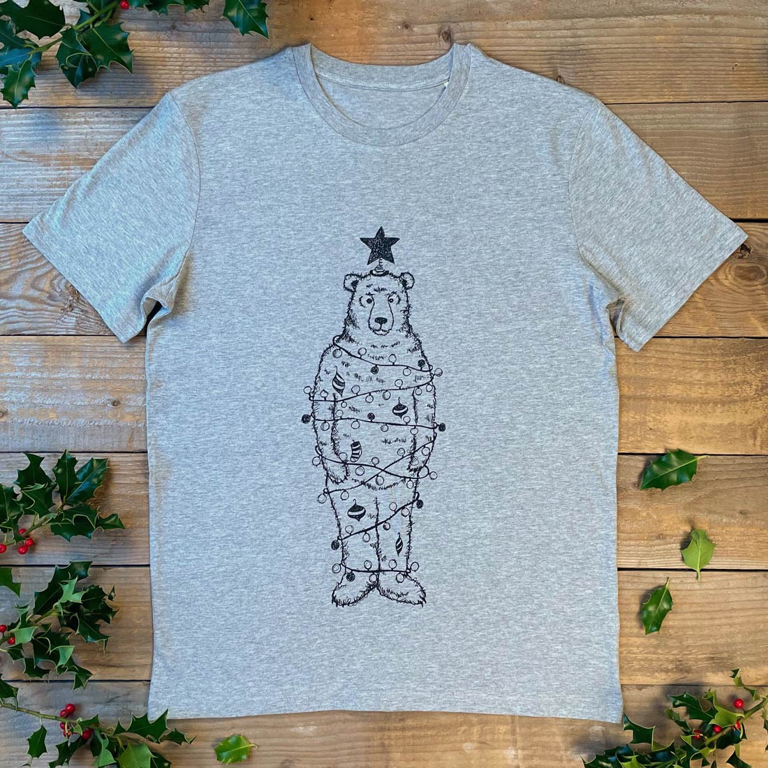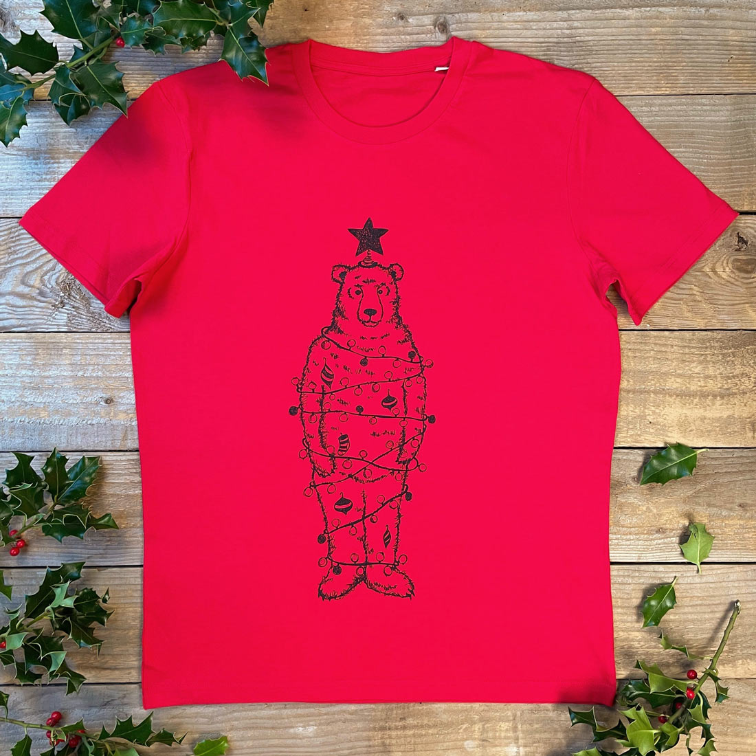 GREEN CHRISTMAS BEAR T-SHIRT. A bear wrapped in christmas lights