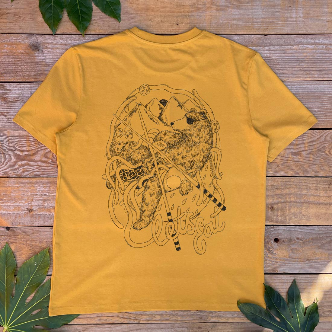 mustard tee with bear eating ramen noodles